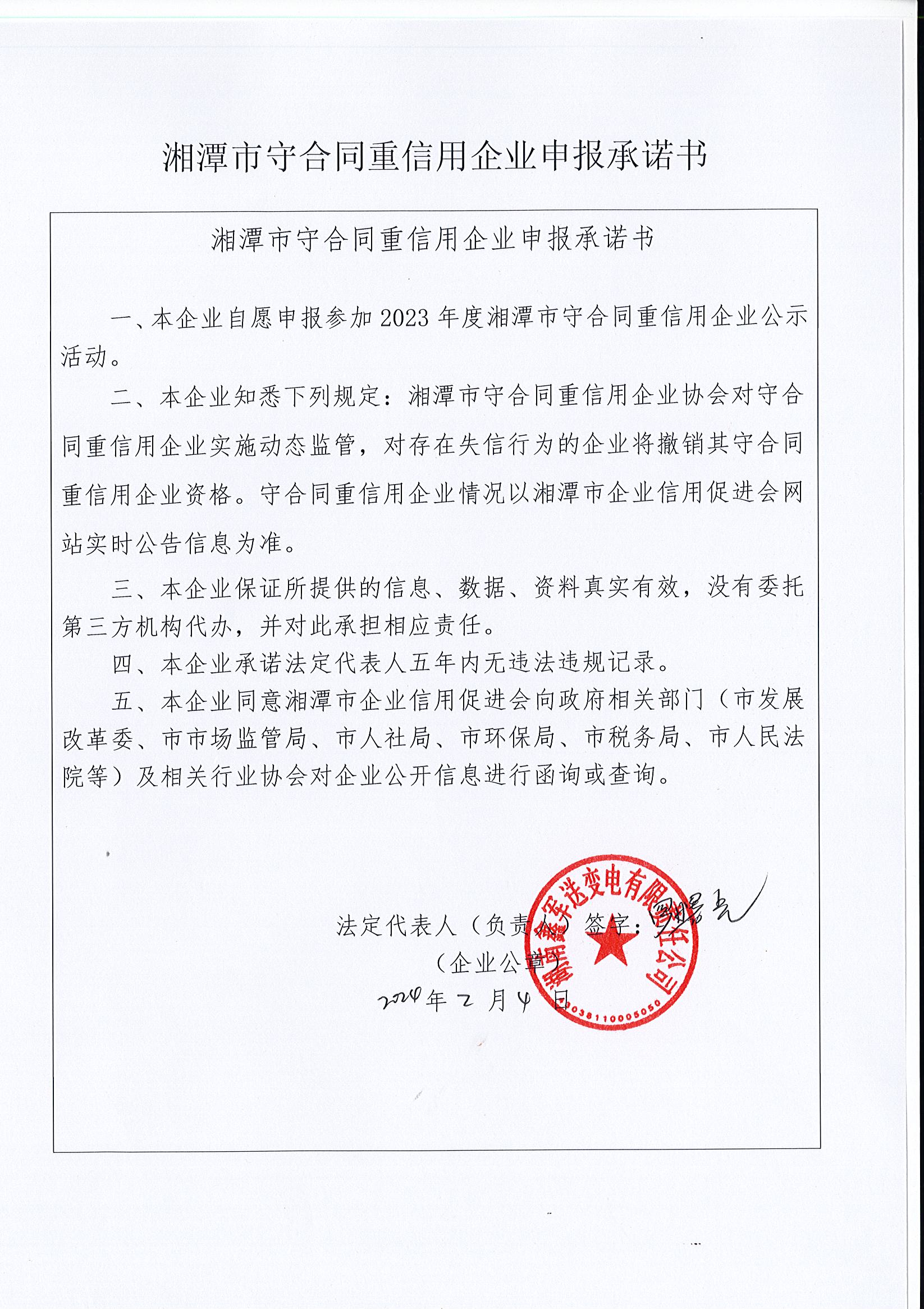 本企業(yè)根據(jù)《湘潭市守合同重信用企業(yè)申報(bào)規(guī)定》等編制 2023 年度企業(yè)信用報(bào)告書(shū),并保證本報(bào)告書(shū)內(nèi)容真實(shí)、準(zhǔn)確、完整。