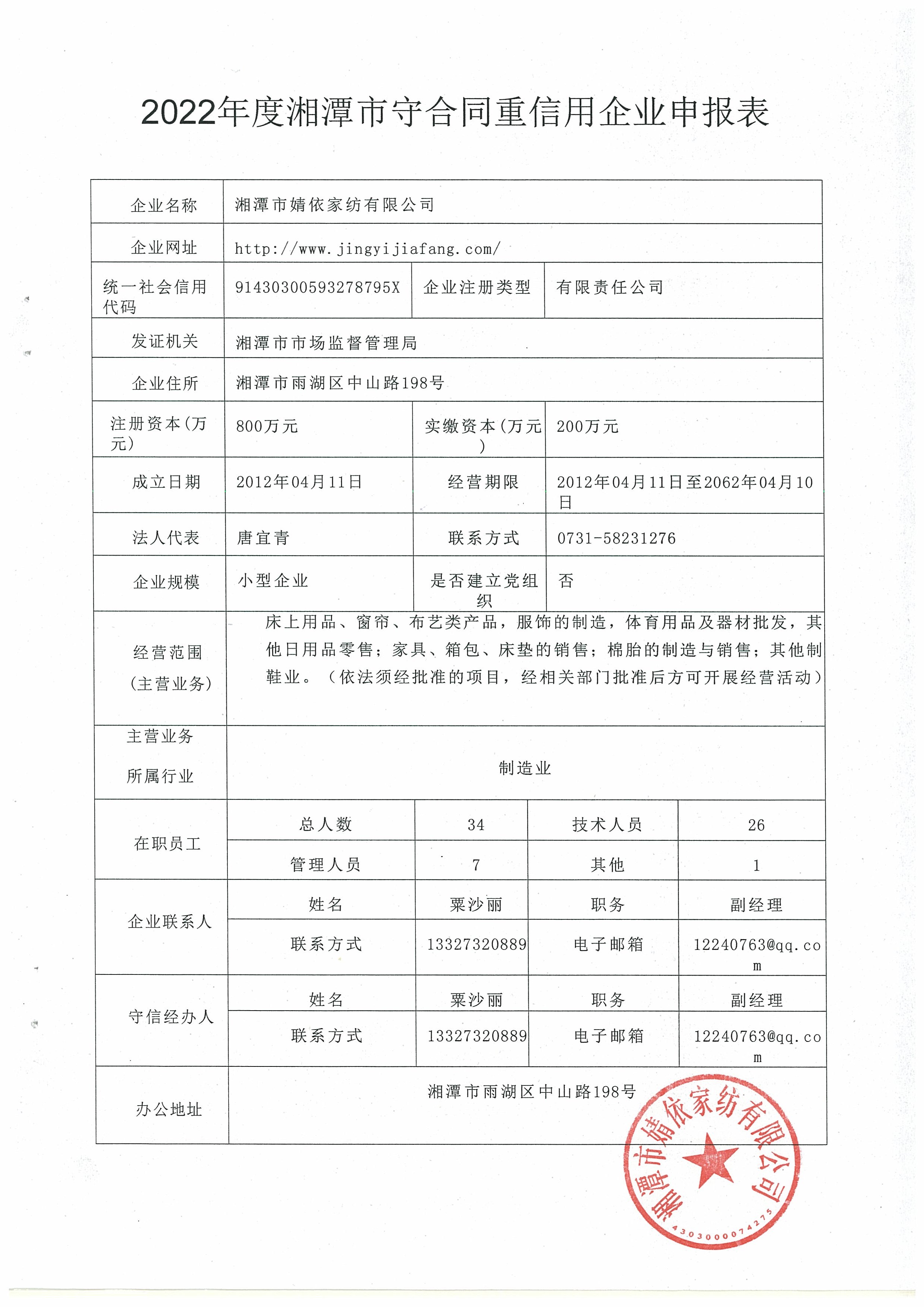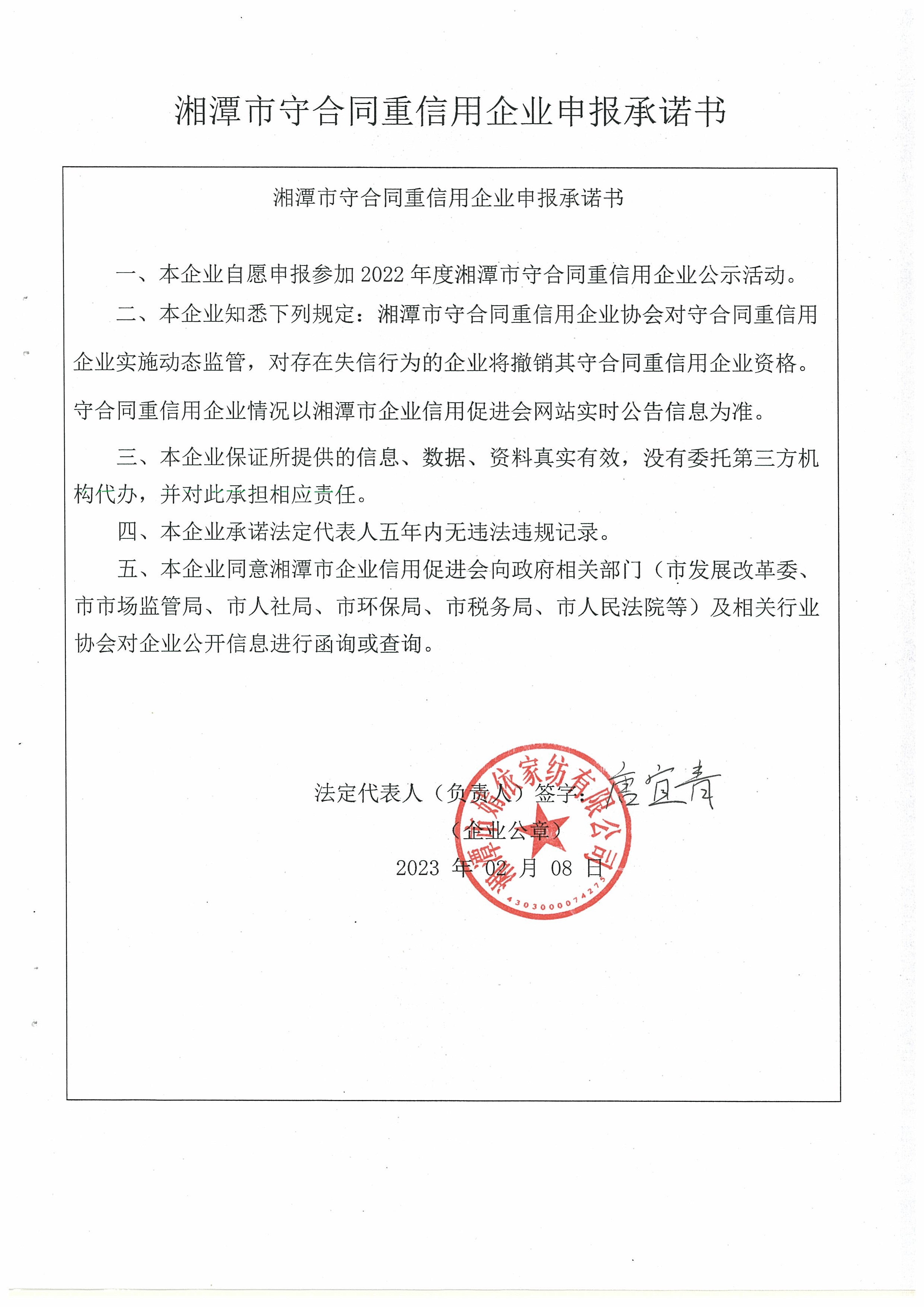 本企業(yè)根據(jù)《湘潭市守合同重信用企業(yè)申報規(guī)定》等編制 2022 年度企業(yè)信用報告書,并保證本報告書內(nèi)容真實、準確、完整。